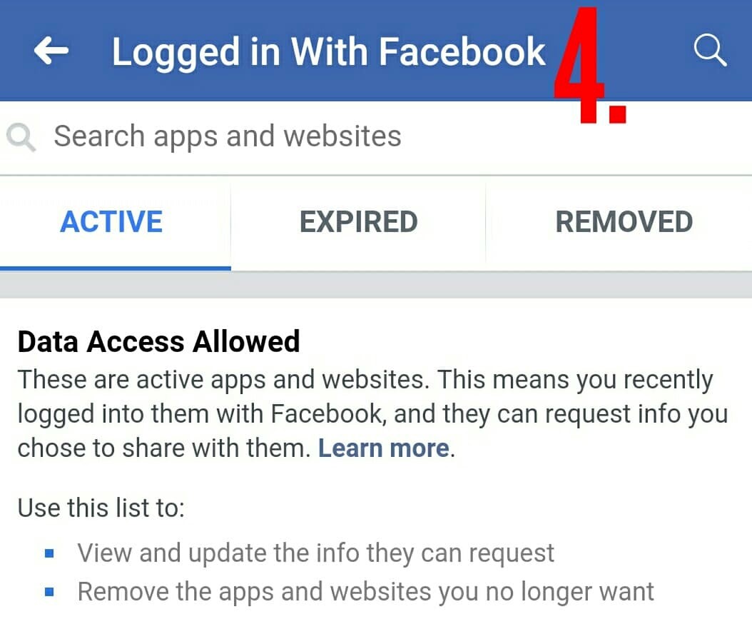 4. Click Logged in with Facebook. Filter between Active, Expired or Removed at the top, or search for a specific app or website using the search bar to the right.